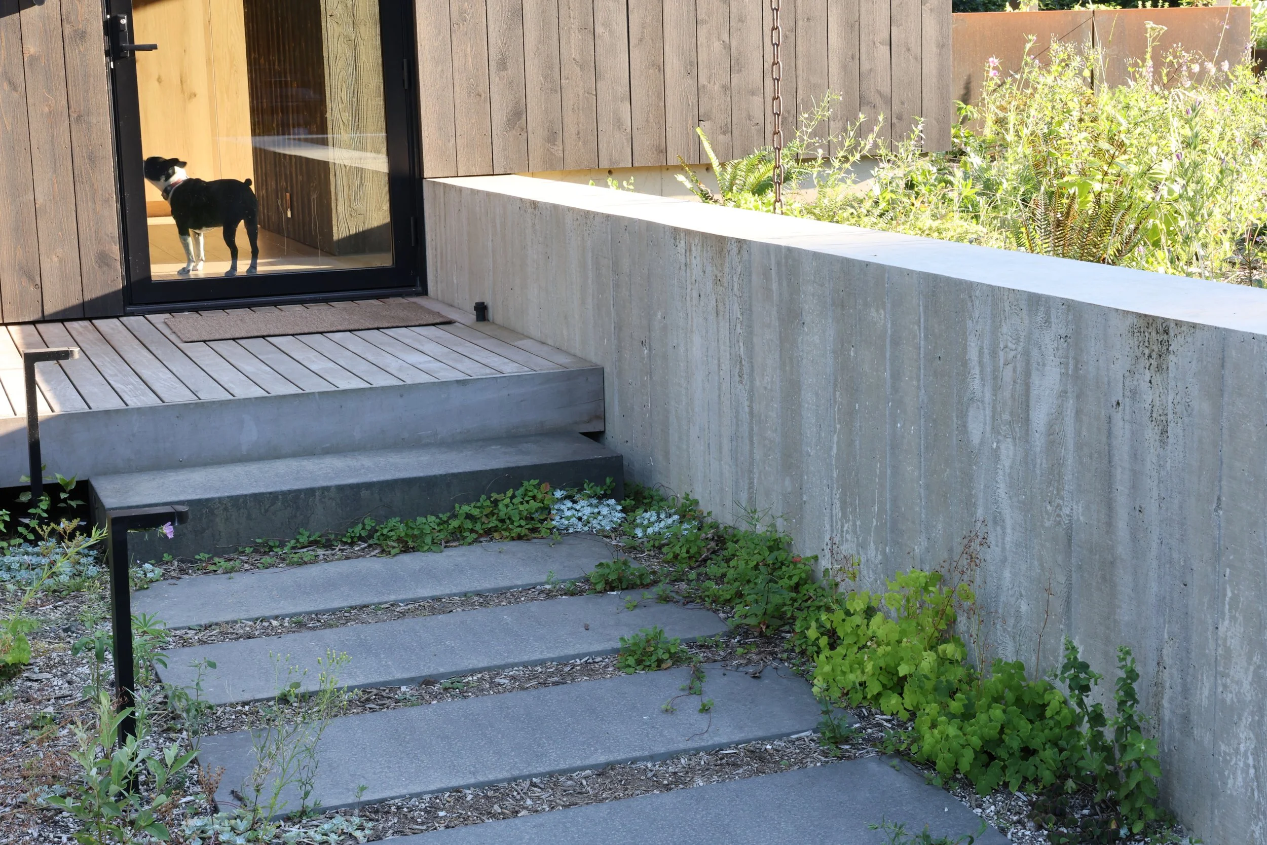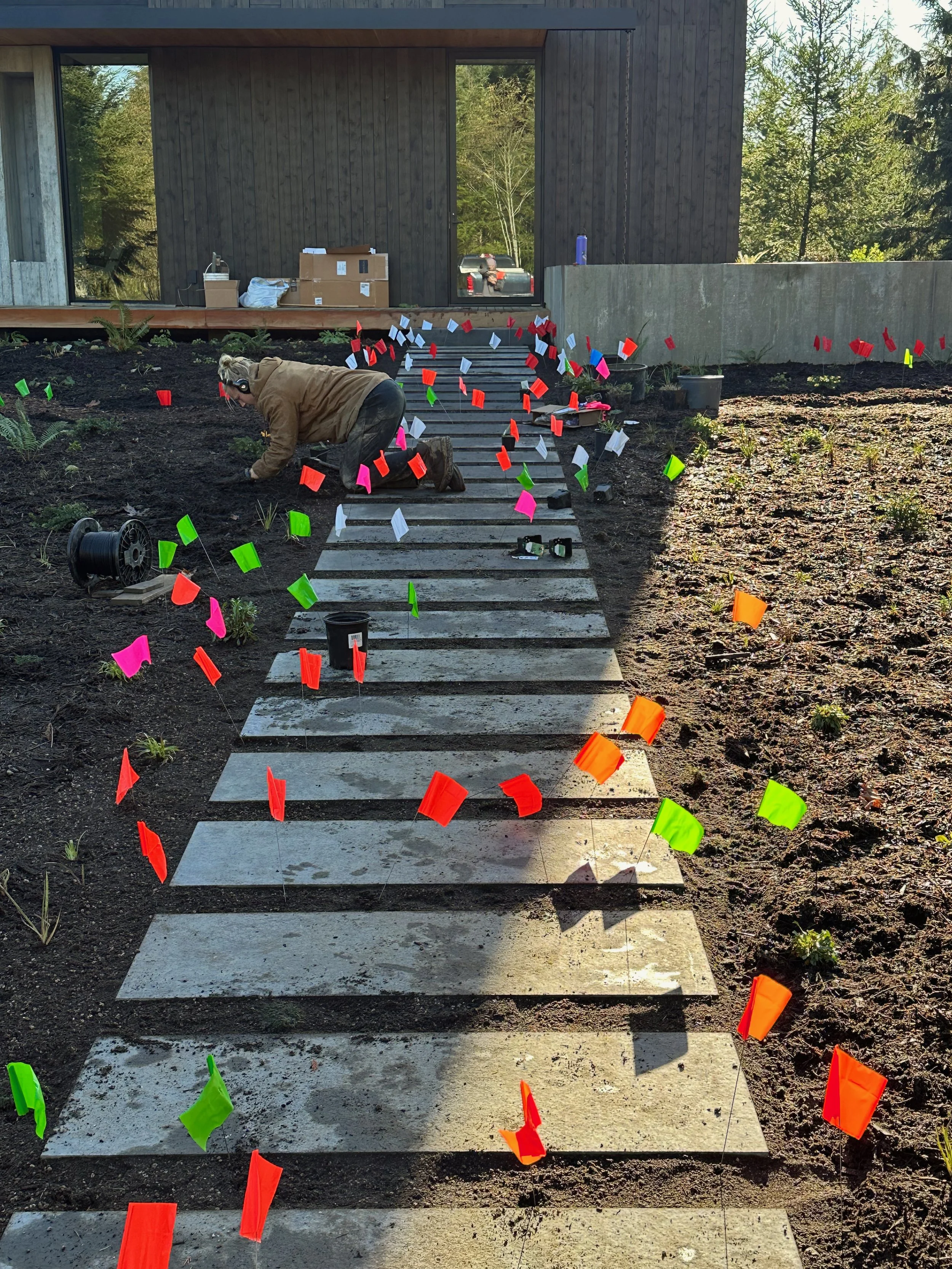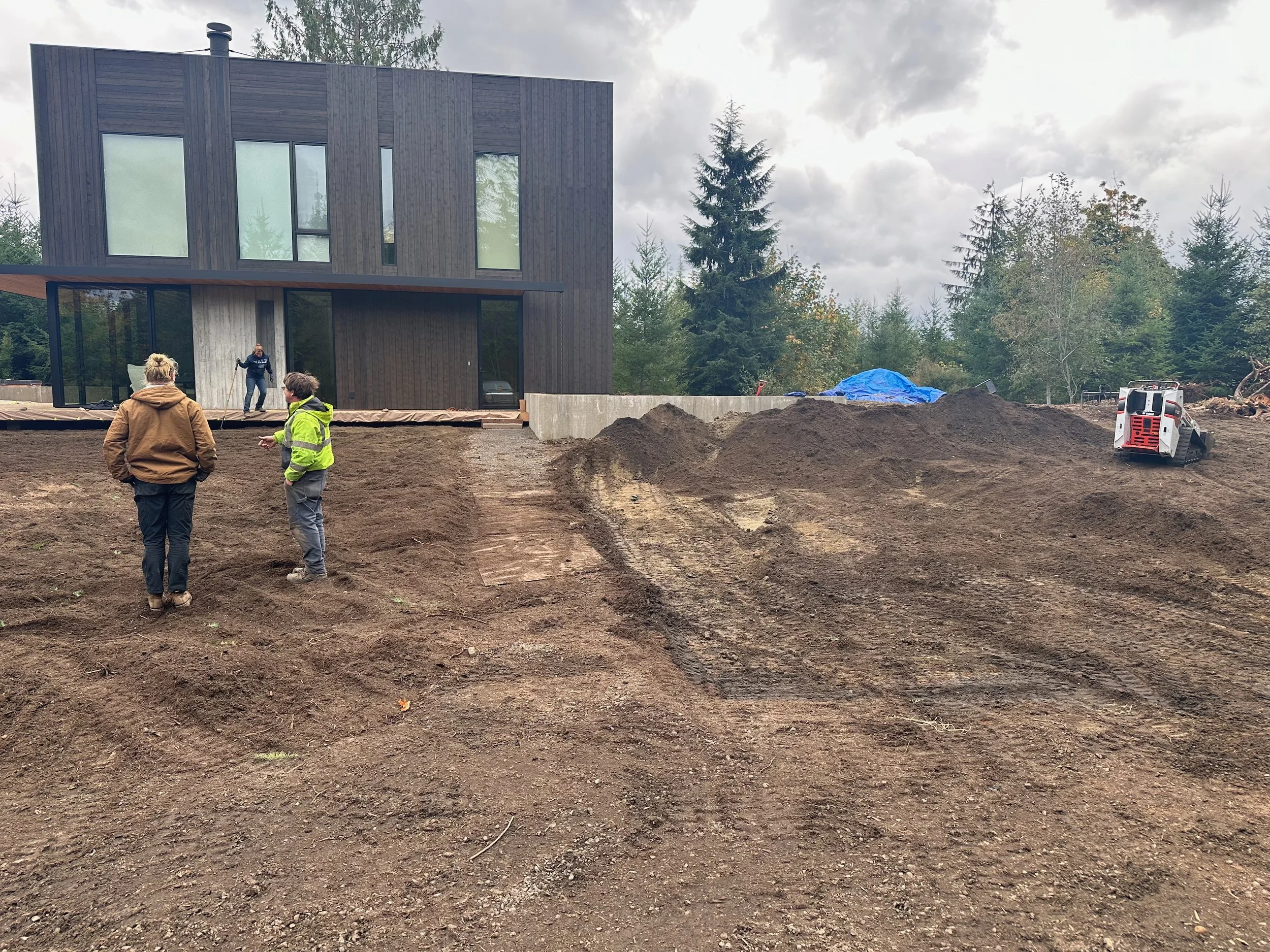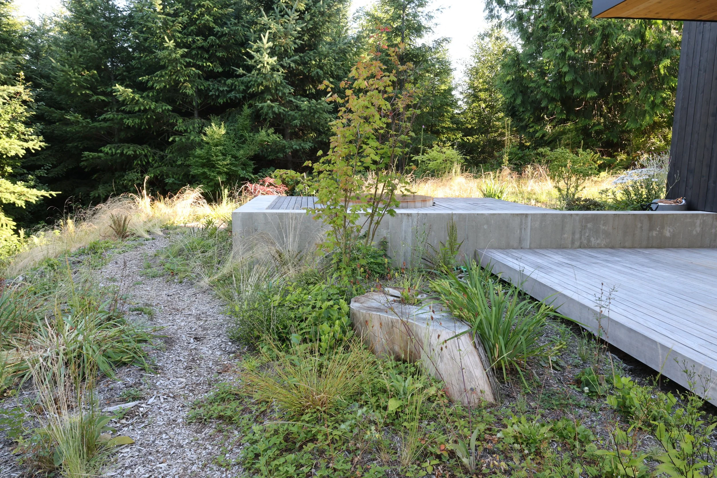 The goal for this garden was to knit the forest back together so that the house would feel like it's part of the forest again. We started out with poor sandy soil, needing to build it up over time to eventually make it cozy for the later succession species like sword ferns and douglas firs. It’s too raw and scary for those more tender forest plants right now.