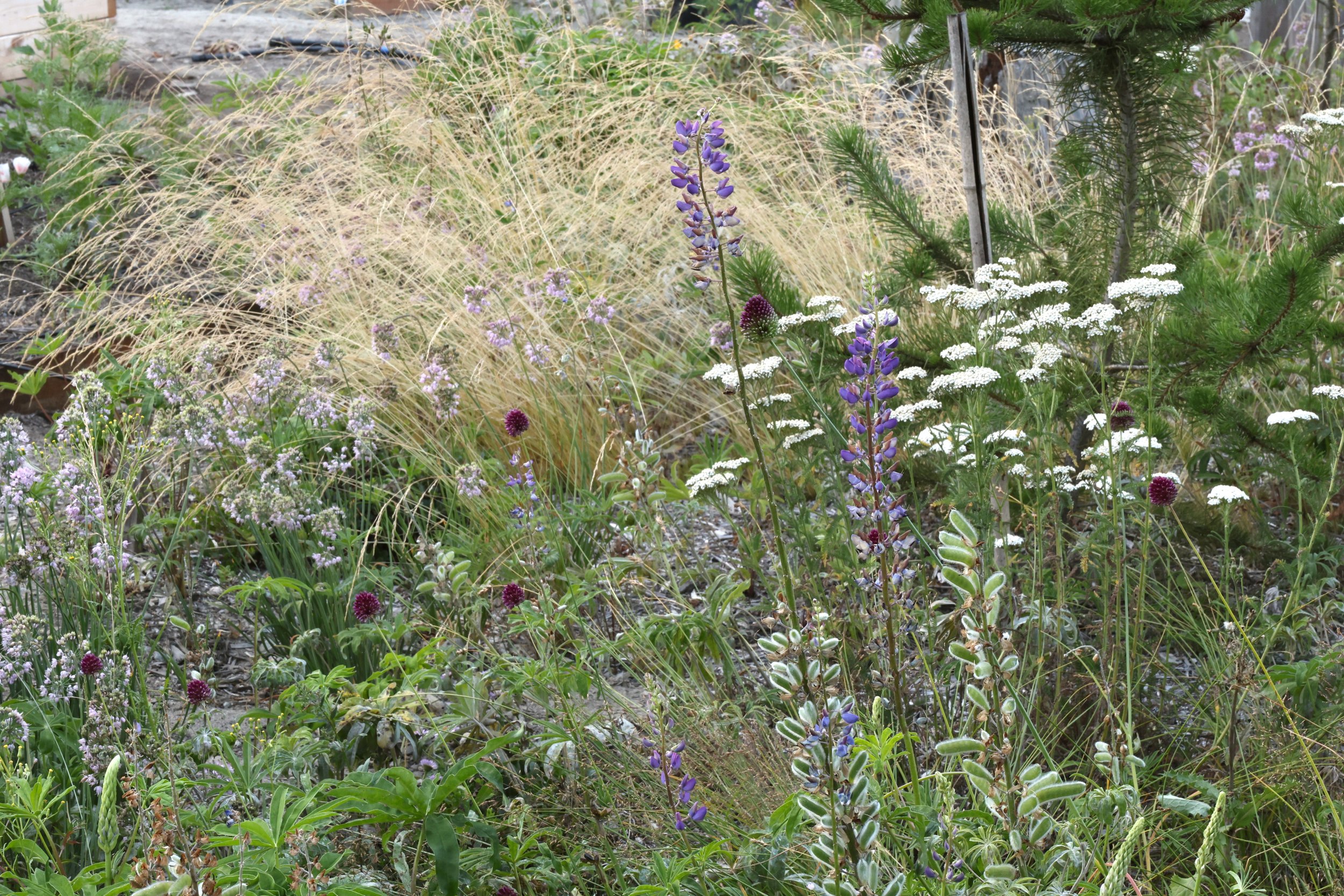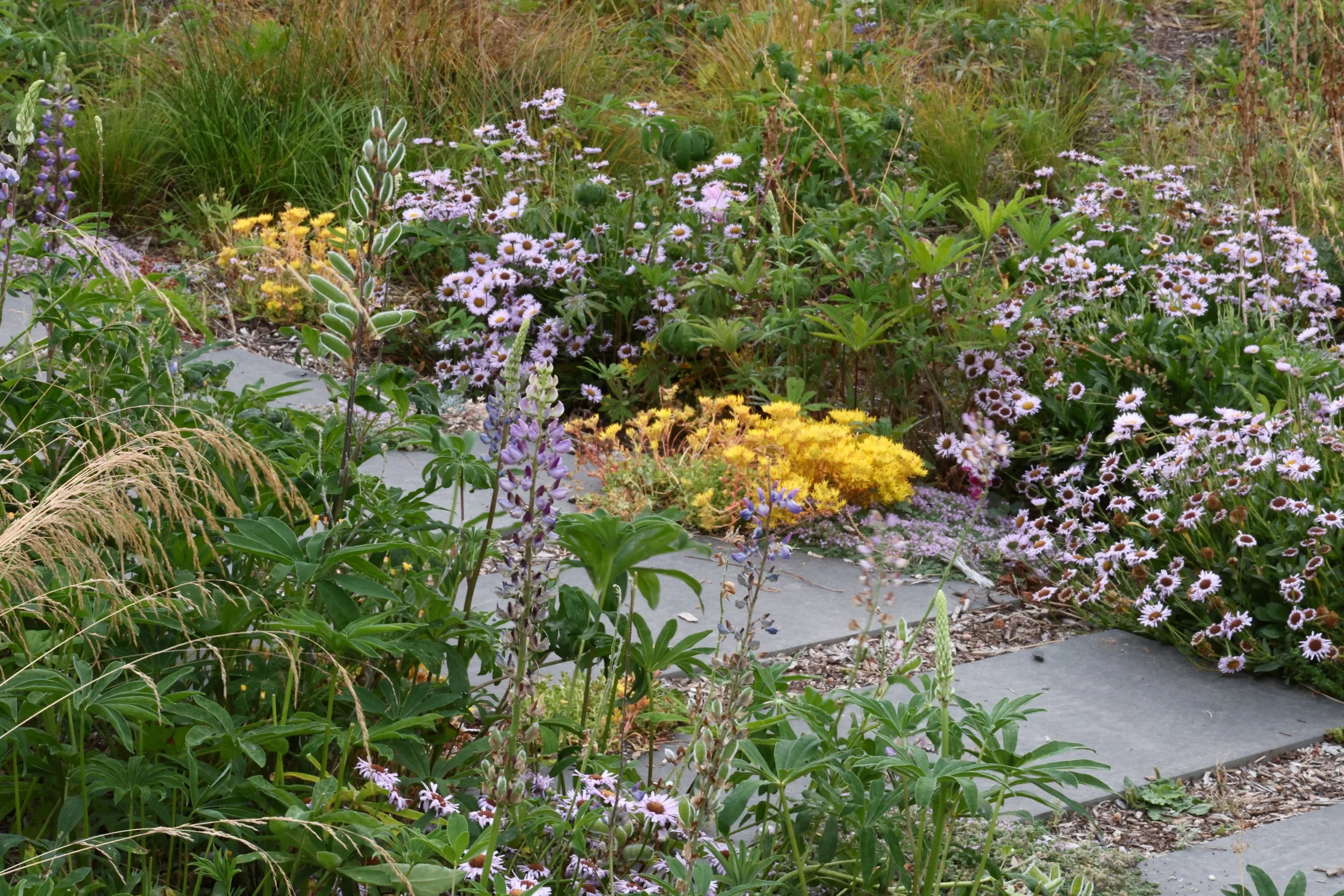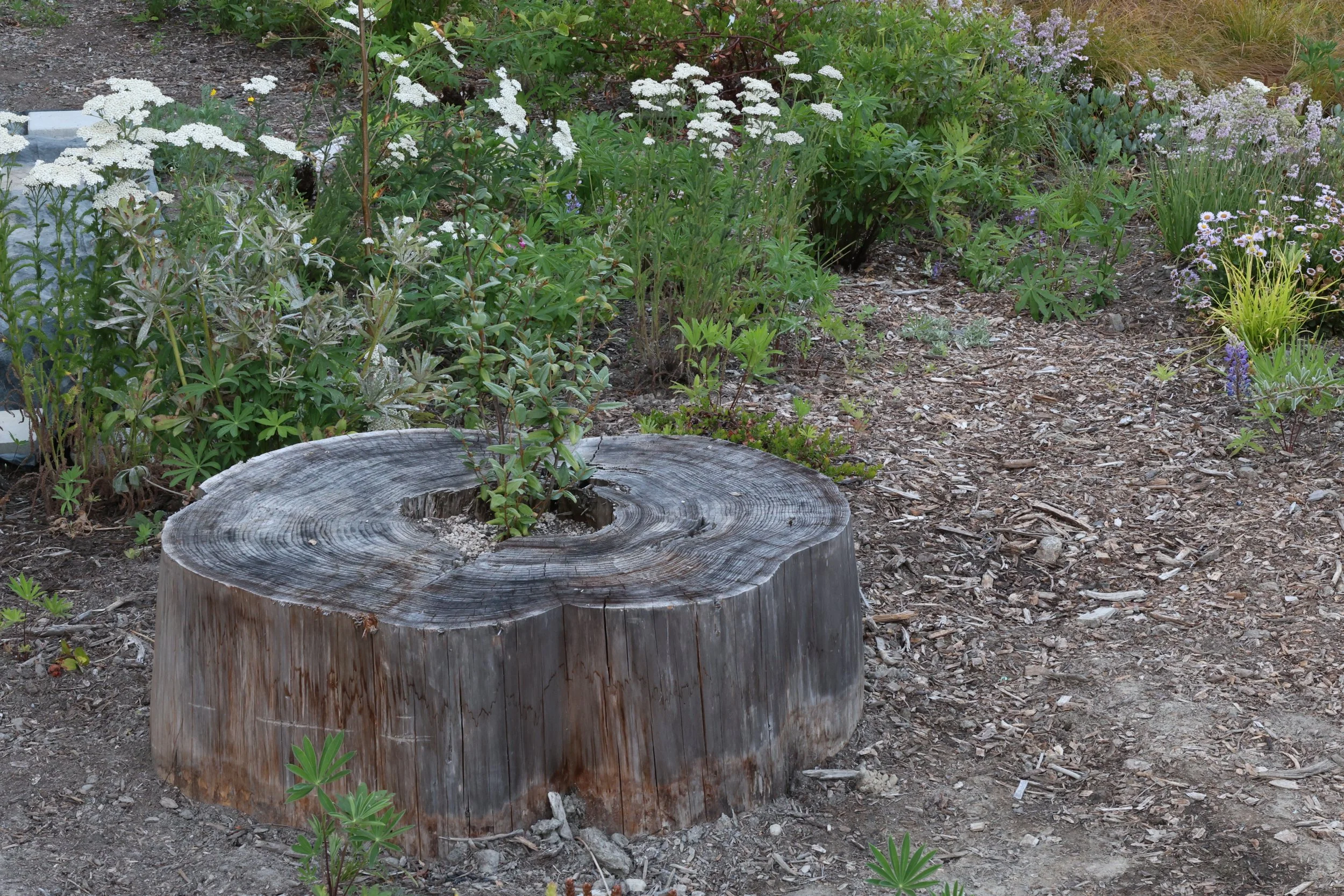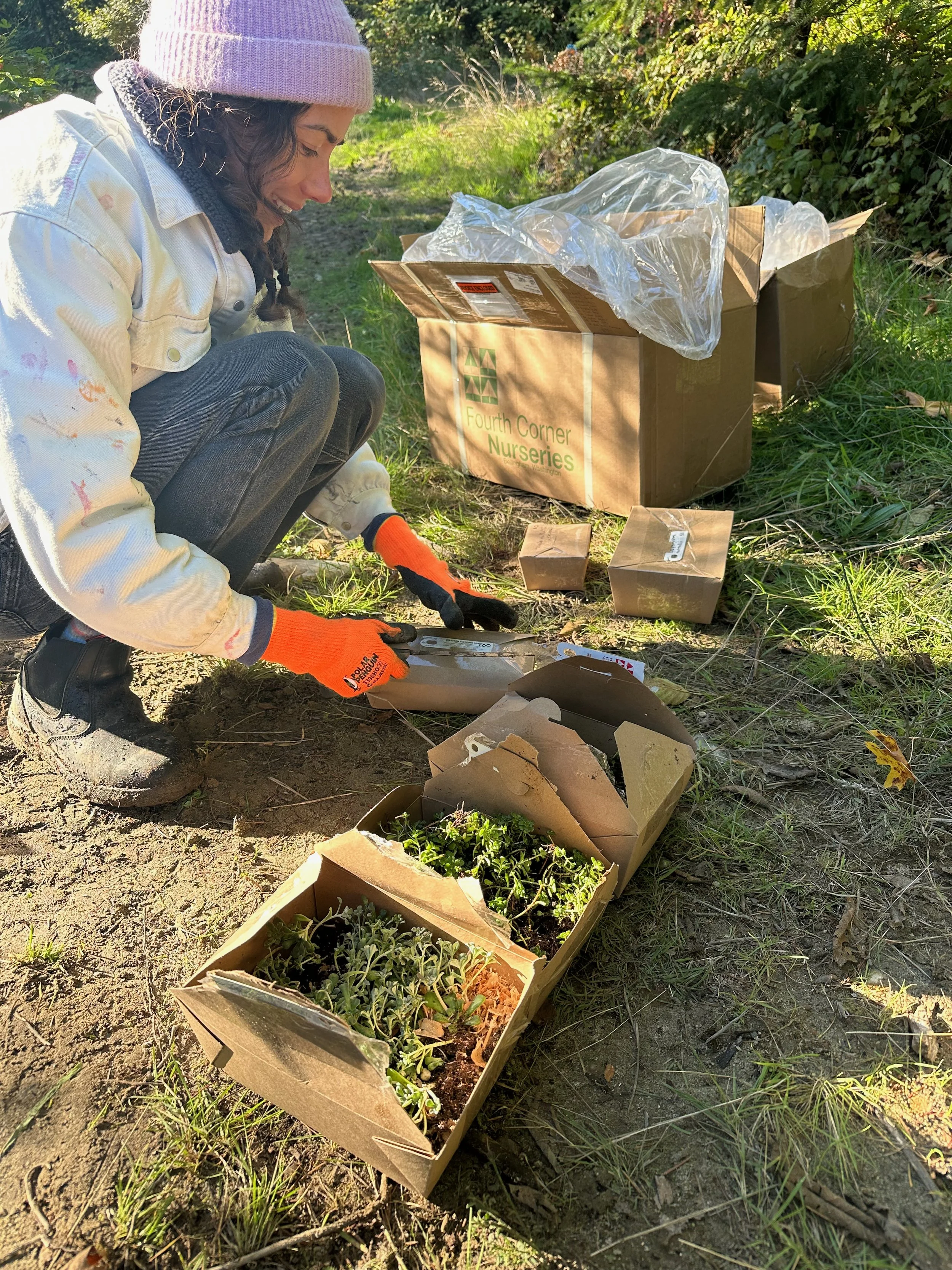 The goal right now is to make it look nice and to cover the ground so that there's less weeding to do and less fending off noxious weeds. And the idea is that over time, the adjacent forest, the sword ferns, the salal, these things can start to seed into, and spread into the garden as the soil gets enriched by the life happening in this kind of newly formed soil. So it's the idea that we're making it work now, making it beautiful now, but also letting it evolve over time, as these other plants move in, and as the soil gets more situated.